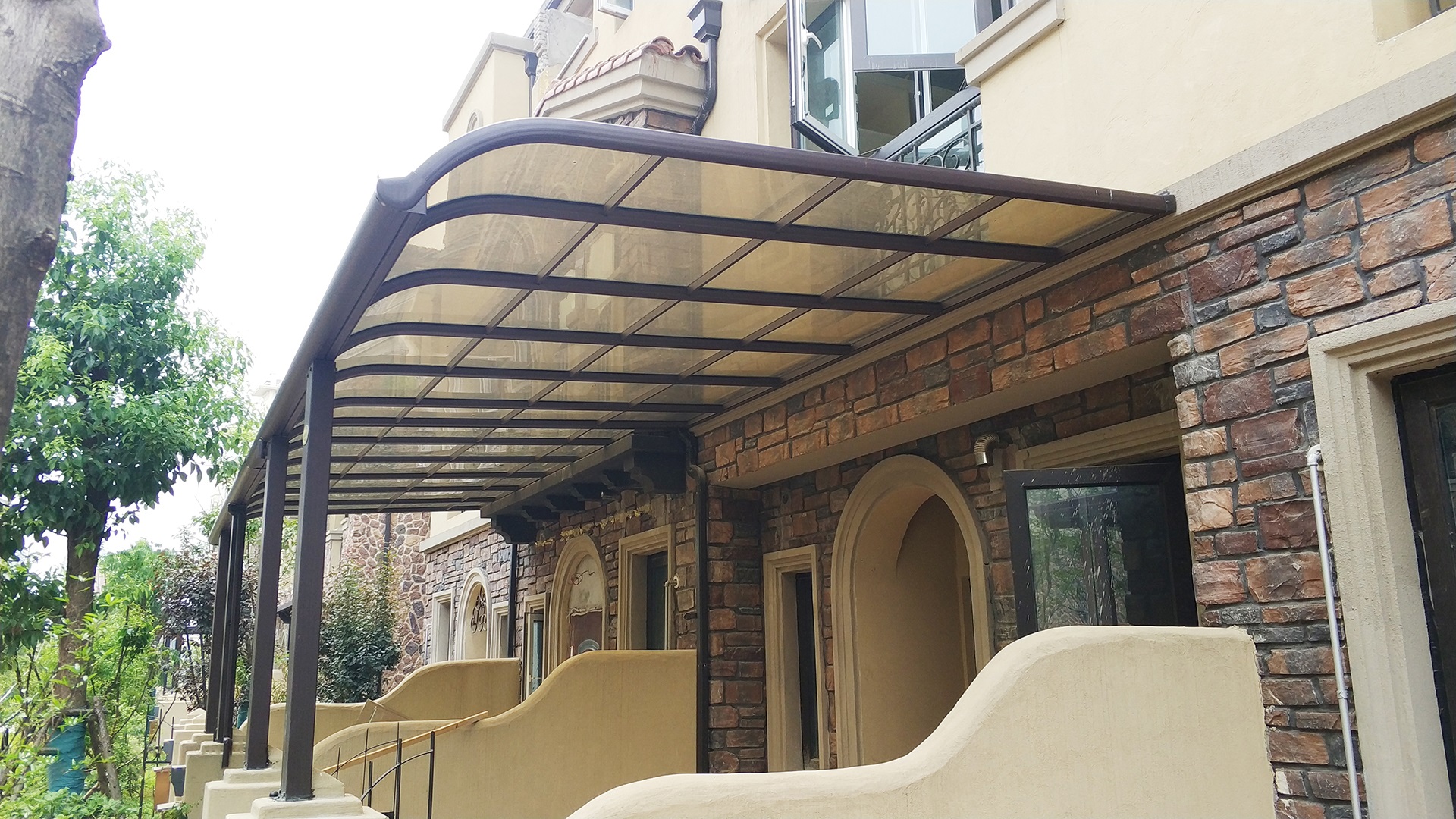 棚顶材料采用德国拜耳进口原料聚碳酸酯板又称PC耐力板,可以吸收阳光中的紫外线,遮阳隔热,在阳光暴晒下不会变黄,雾化,透光量适中。